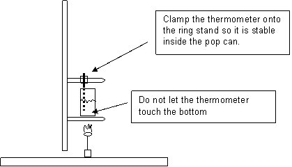Walnut, stopper with wire, pop can, temperature probe/computer, ring stand, ceramic centered wire gauze, clamps